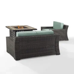 Spend warm summer days and cool summer nights with the Bradenton 3pc Conversation Set. The loveseat and armchair are made from all-weather resin wicker with seat cushions covered in solution-dyed polyester. The outdoor seating surrounds a fire table constructed from sturdy powder-coated steel. The fire table’s tiled top and lattice paneled base offer a unique design that will elevate your outdoor space. The gas controls and a rack for a propane tank are located inside the table’s base, keeping them close at hand but out of sight. You’ll be ready to relax in comfort with the Bradenton conversation set.