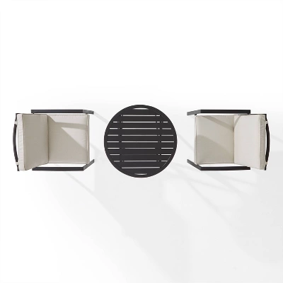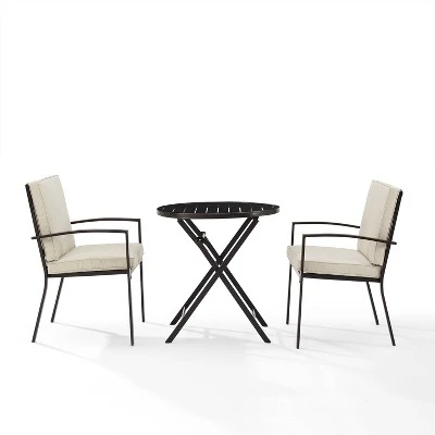 At home on a small balcony or deck, the Kaplan 3pc Bistro Set creates an intimate outdoor dining space. Two cushioned dining chairs feature weather-resistant cushion covers and pair beautifully with the powder-coated steel folding table. With a classic slatted top, the bistro table offers enough space to share an evening meal and folds away easily when not in use. Cozy up and enjoy a meal under the stars with the Kaplan bistro set.