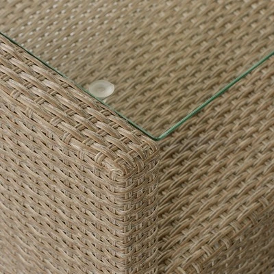 Give your backyard a classy polished seating space with our 4-Piece Conversation Patio Set. Charming in design, this set features a 2 seater sofa, lounge sofa, coffee table and side sofa chair. Instantly create a cohesive sectional by simply pushing the 2 seater sofa and lounge sofa together, or separate them if you want your patio set to cover a larger area of space. Crafted with a classic beige thick woven rattan wicker weaving reinforced with rust resistant steel, this patio set is resistant to water, cracking, splitting and sun rays so it can last years to come. The center coffee table features a modern floating glass surface perfect for placing food and drinks to make spending time outdoors even more enjoyable. Lean back and relax for hours on end with the thick high density foam cushions upholstered in soft fabric covers that are formulated for easy spot cleaning, and enjoy the four back cushions that feature charming button tufting for an elegant appearance.