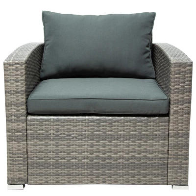 - [Set of 7] This PE rattan sofa set is modern in design, consisting of 1 side armchair, 1 left armchair, 2 right armchairs, 1 left armrest loveseat, 1 rectangular coffee table and 1 square storage Grid composition. In addition, this PE rattan sofa has 13 cushions.