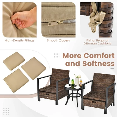 Equipped with seat cushions, back cushions and ottoman cushions, both the chair and ottomans offer you more comfort and softness. And the ottoman can be also used as an addition seat or a patio side table for more convenience. The whole set is mainly made of rustproof metal and durable PVC rattan for long-lasting service life. And the tempered glass coffee table is sturdy and easy to maintain. Furthermore, the cut-out handle of ottoman allows you to easily move the ottoman anywhere. And when not in use, the ottoman can be pushed under the chair for space saving.