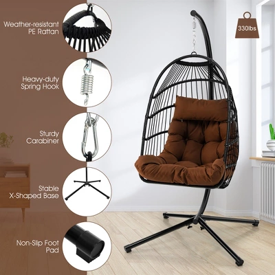 Are you looking for a stylish and sturdy swing egg chair for your garden, backyard or in your house? This patio egg chair with stand and anti-dust cover will be the best choice for you. Made of anti-rust steel frame and all-weather PE rattan, this egg hanging chair can stand the test of time. If you use it indoors, the anti-slip foot pads can protect your floor from scratching while increasing overall stability. What’s more, the soft pillow and cushion bring optimal comfort for you to relax. With a safety strap, reinforced steel hook and sturdy base, the egg chair can hold up to 330 lbs. Enjoy your leisure time with this hanging egg chair.