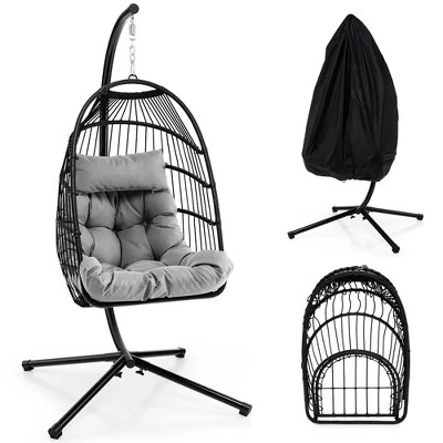 - Foldable Seat Basket: The seat basket can be folded into a compact size to take up less space when not in use. Dimension of folding basket: 29’’ x 43.5’’ x 7’’ (L x W x H). Overall dimension: 39.5” x 39.5” x 77’’(L x W x H). Package includes a hanging chair, an anti-dust cover and a stand. Requires simple assembly.