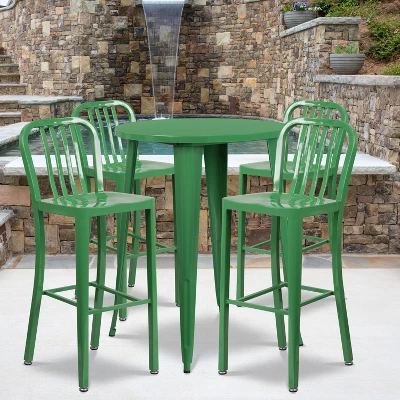 Complete your dining room, restaurant or patio with this chic bar table and chair set. This colorful set will add a retro-modern look to your home or eatery. Table features a smooth top and protective rubber floor glides. The industrial style barstool features an attractive vertical slat back. This 5 piece table set is designed for indoor and outdoor settings. For longevity, care should be taken to protect from long periods of wet weather. The possibilities are endless with the multitude of environments in which you can use this table, for both commercial and residential spaces. Additional Features: Vertical Slat Back, Footrest, Adjustable Floor Glides, Chair Size: 15.5″W x 20″D x 43″H, Back Size: 15.5″W x 13.75″H