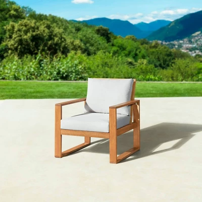 Add style and sophistication to your outdoor living space with this attractive Eucalyptus Wood Outdoor Chair. Frame is made from durable eucalyptus wood that will stand up to varying weather conditions, and the generously padded all-weather cushions will provide luxurious comfort all day long. The neutral wood finish and gray colored cushions will easily match with any accent pieces in your outdoor space, or pair this beautiful outdoor chair with other items in the collection for the perfect outdoor entertainment space!