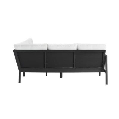 This modern sectional sofa creates a home base for your family and friends during outdoor parties. The sturdy aluminum frame supports up to 5 comfortably, while the black powder coated finish protects against rust and lends itself to a sleek aesthetic. The plush cushions are upholstered in white Sunbrella™ fabric that is fade, stain and mold resistant, so you can enjoy a like new look and feel for years to come. Matching chairs, tables and more are also available for purchase.