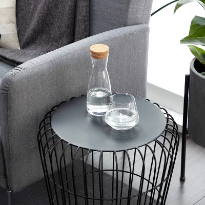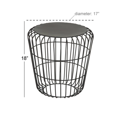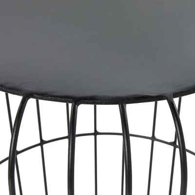 - This round outdoor accent table highlights a cage-like base made of metal rods