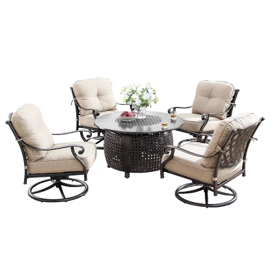 Oakland Living 5pc Deep Seating Swivel Aluminum Outdoor Patio Fire Pit Dining Set With Round Fire Table Copper